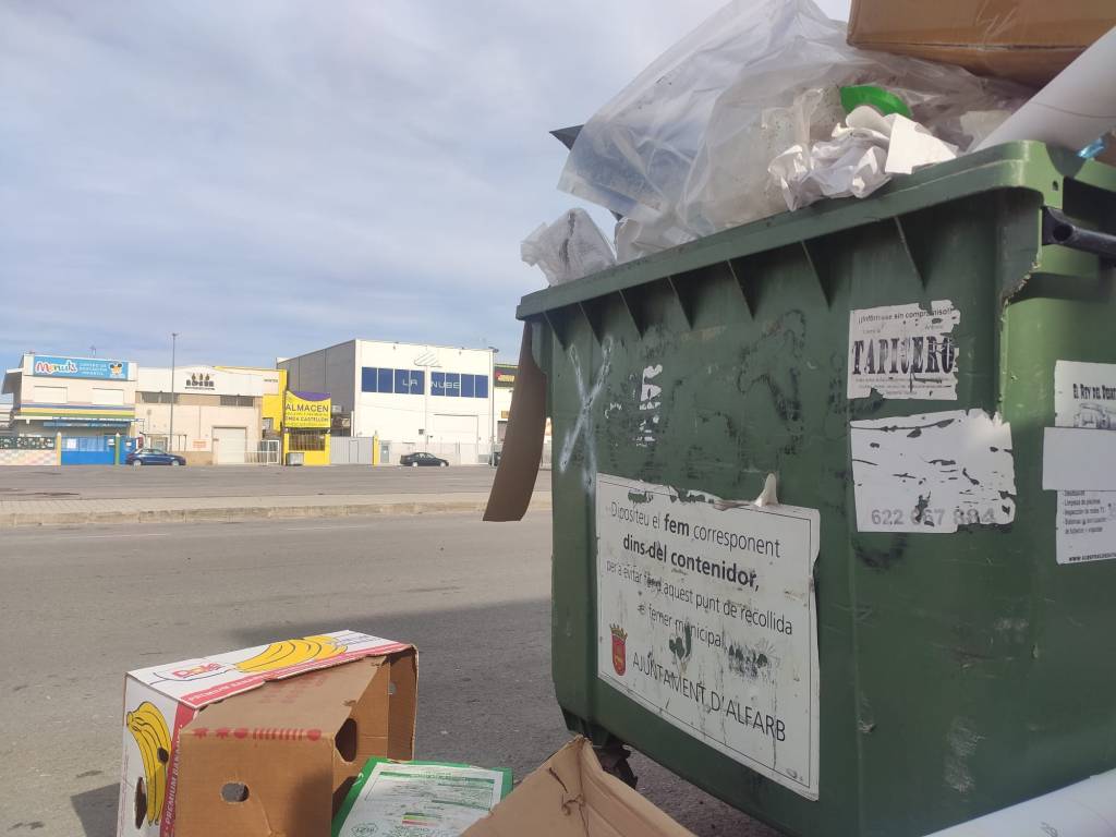 Las pegatinas con el rótulo del Ayuntamiento de Alfarb o de la Mancomunitat del Marquesat dan prueba de ello. En su mayoría se trata de contenedores viejos y todos (como todos los del polígono industrial) que también portan el logo de la empresa VARESER SL, empresa que presta actualmente el servicio de recogida de basuras y limpieza viaria en Massanassa.