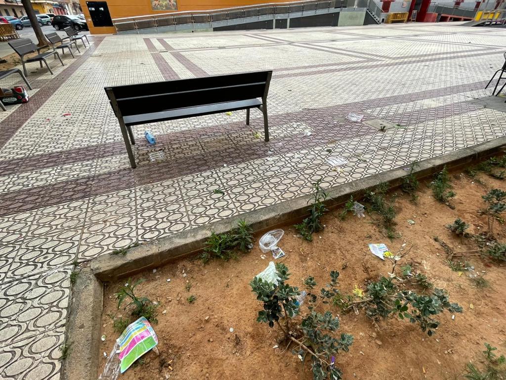 «Hay basura todos los días, griterío, muebles rotos en los contenedores que permanecen varios días y hasta mean en lo que se supone son las jardineras de la plaza», afirma un vecino que vive en la propia plaza y que ha escrito a Gent de Massanassa pidiendo dar a conocer la problemática.